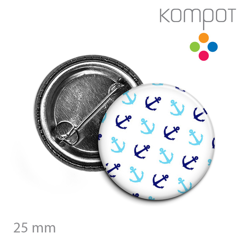 Placka o průměru 2,5 cm, vzadu klasické zapínání na integrovaný spínací špendlík.